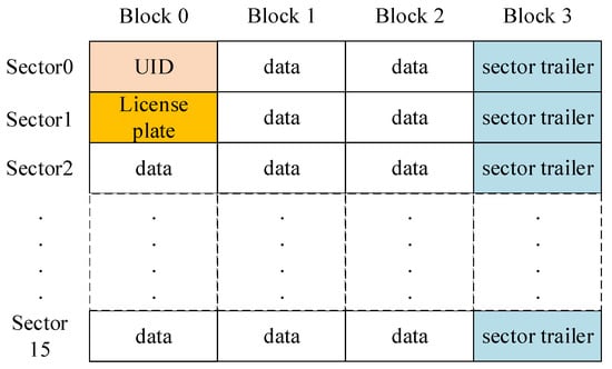 Figure 10 shows the architecture of the sub-cabinet. The placement of the STB from its charging stand activates the RFID to read the information from the STB. When the STB and key are put in or moved from the sub-cabinet, the RFID sensor transmits the license plate information to the MCU that processes the information coding in JSON format. The coded information is uploaded to the cloud server. The return code in JSON format is sent back to the MCU to confirm the placement or displacement of the key and STB. The RFID card has a 1 KB EEPROM memory. To manage and achieve the multi-purpose function properly, the memory space is divided into 16 sectors, each of which has 4 blocks. Block 0 of segment 0 contains the card’s unique identification code (user identifier, UID). In this study, the license plate information is stored in block 0 of Section 1 (Figure 11). The WiFi communication format uploads data through the POST method in the HTTP, which is also encoded in JSON format. The uploaded information includes data on the location, license plate, sub-cabinet, and the open/close of cabinet doors.