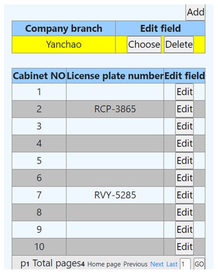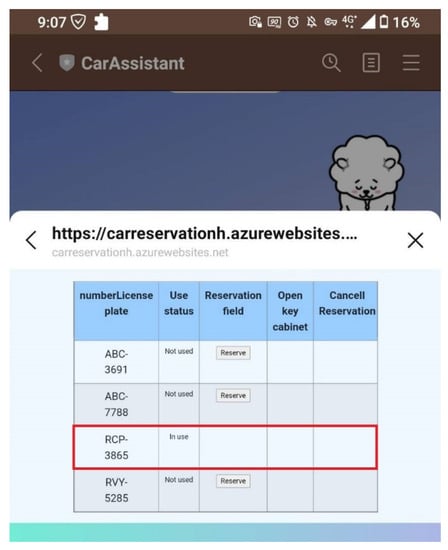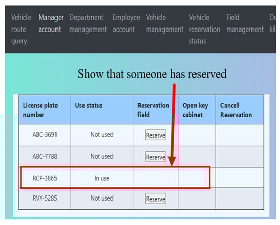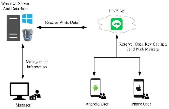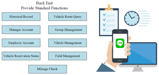 The cloud server stores data by interfacing with Line API so that managers can conduct data analysis of the vehicles. The familiar interface of Line allows users to use the system easily to reserve the use of the cabinet. The diagram of the cloud server is shown in Figure 12. For making a reservation, a user opens the cabinet door through LINE and takes the key and STB. At the same time, the information of the user is sent back to the cloud server. In the background management system, the use of official vehicles is managed and monitored.