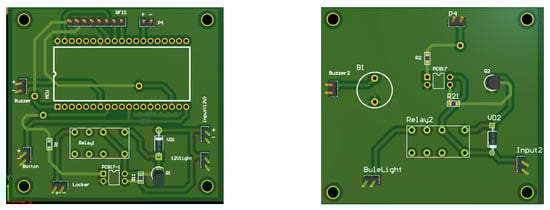 The 3D diagram of the key cabinet is shown in Figure 20. Figure 21 and Figure 22 show the internal circuit design diagram and PCB layout of the official vehicle cabinet. To solve the problem that the I2C signal of RFID is easily affected by the relay coil, the upper and lower boards are designed to have reduced sizes.