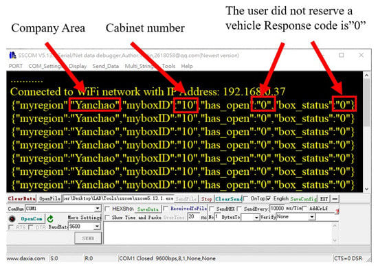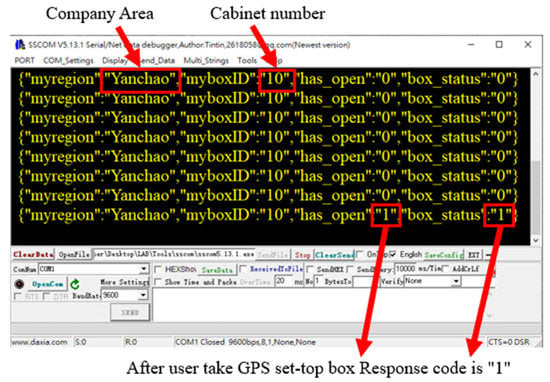 The transmission format of the independent key locker transmits data every second in the JSON format to find out whether a registered user in the server uses a vehicle. This action is verified through the computer’s serial transmission platform SSCOM. When accessing the background database system, it returns messages such as “myregion” (the company’s area), “myboxID” (the cabinet), “has_open” (whether there is an open cabinet), and “box_status” (whether the cabinet has the key and STB). If no user uses the key and STB in a sub-cabinet, the return values of the “has_open” and “box_status” background database systems are both “0”, as shown in Figure 24.
