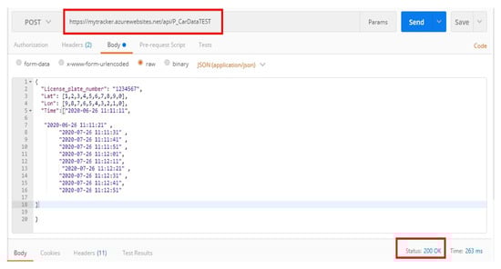 To test whether the GPS data of the STB successfully transmitted to the background server, a test is performed through the third-party software Postman, as shown in Figure 26. The test data are put in the JSON format, and a request URL is sent to the by POST. The transmission result is displayed in the lower right. The status code is 200, which means the transmission is successful and the server-side receiver functions normally.