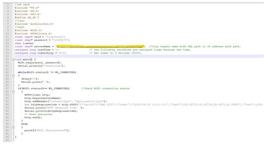 For testing STB transmission, a program is created in C language and ported to the MCU on the backend server (Figure 27). When tested with the same request URL, the GPS path data and transmission time are successfully displayed on the server side (Figure 28).