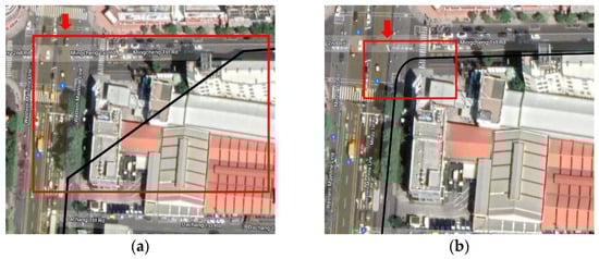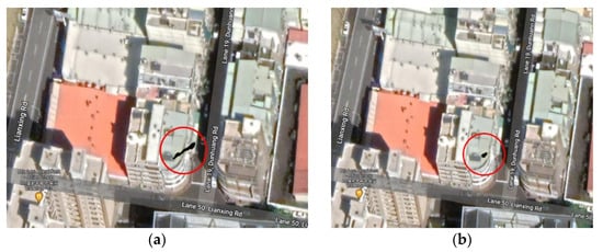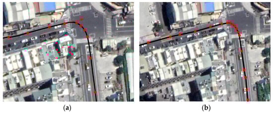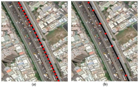In a driving test, an average moving speed is about 40 km/h. Figure 30 shows that movement tracking is performed at sampling intervals of 1 and 5 s. In Figure 30a, when the sampling interval is long, blind spots occur at the corner, resulting in a large deviation in the point-to-point connection of the path movement tracking. Thus, a short sampling interval allows movement tracking to be more efficient, as shown in Figure 30b.