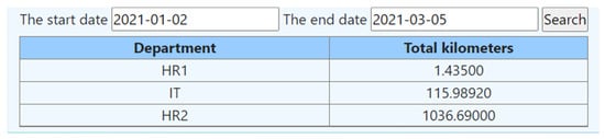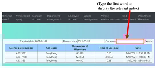In the back-end system, administrators can search the user’s past driving records. The record can be quickly searched with date, user information, and vehicle information, as shown in Figure 35 and Figure 36. The Google map API is used for the vehicle path query to show the historical trajectory.