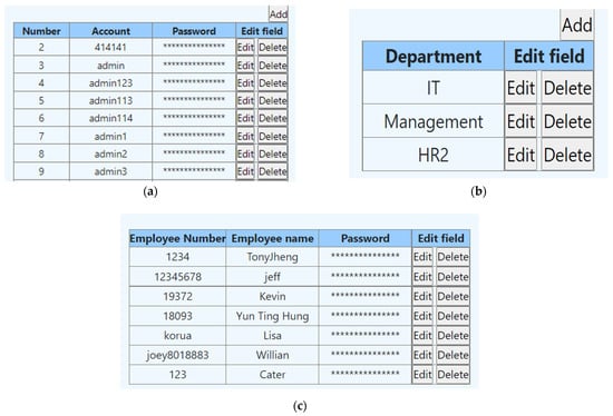 Figure 37 shows the management system of the official vehicle. To manage the personal data of employees easily, the system allows accounts for three managers, four departments, and five employees for account management. The administrator account information is required to log in to the system, as shown Figure 37a. The required information can be changed according to the situation. In the department account, employees of each department are registered to manage their vehicle uses. In the employee account, the personal information of employees is managed after it is registered through the Line API, as shown in Figure 37b,c.