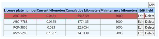 After the user returns the key and the STB of the vehicle to the cabinet, the stored data of the micro-SD card are automatically transmitted to the cloud server through WiFi (Figure 6). The data are uploaded to the database of the cloud server in JavaScript object notation (JSON) format (Figure 7). The JSON format has the characteristics of reading, writing, and lightweight and is easy to parse and classify in the background database. In uploading the data, the STB acts as a client and sets the URL and IP address in the background to submit the data to the backend SQL server database by POST method in the hypertext transfer protocol (HTTP). The data are displayed on the management page through the classification processing of driving data. To avoid data abnormality and loss during transmission, the server returns the number and status to define the following status codes after each data transmission. The STB then makes a warning according to the status code, as shown in Table 2, when the transmission data are abnormal.