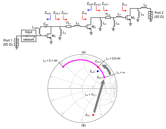 The second interstage matching between M2 and M3 is performed in a similar way to the first interstage matching. However, the matching frequency is intentionally changed to 26 GHz. As shown in Figure 7c, the input impedance of M3 (Zin3) is transformed to the conjugate of the output impedance of M2 (Zout2*). The center frequency of the matching is tuned to 26 GHz by choosing the value of a shunt inductor (L5) as 0.3 nH. It is noted that the second interstage matching is supposed to have the matching performance sensitive to the adjacent stages more than the first interstage matching. This is because the adjacent impedances are seen through Cgd of M2 and M3, while Cgd of M1 is diminished by the neutralization inductor Lneut. Therefore, an extra shunt inductor (L6) is added as an additional degree of design freedom in the second interstage matching while minimizing the influence on the adjacent matching. The second interstage matching results in the gain peak of the second stage at 25.5 GHz, as observed in Figure 6.