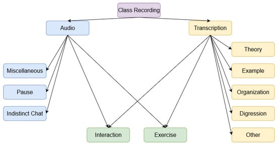 The final dataset consisted of 34 audio files and automated transcriptions, each corresponding to a delivered class, which amounted to a total of 3773 min. We selected recordings from five male professors and five female professors to ensure gender variety, and chose a wide range of subjects, such as mathematics, oceanographic physics, digital signal processing, etc., to ensure subject diversity. A breakdown of the dataset by subject and gender can be found in Table 1. We manually labeled the automated transcriptions following the label hierarchy shown in Figure 1.