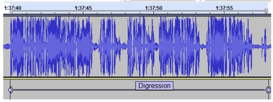Miscellaneous/Pause/Indistinct Chat: As we can see in Figure 2, a Miscellaneous audio segment is identified by the lack of audio signal at the beginning of the recording. Since recordings are scheduled in advance, the scheduled starting time is usually some minutes before the lecture actually begins, and the end of the class may also be a few minutes before the scheduled ending time. Consequently, the recordings contain several minutes where the microphone is off, leaving the recording with muted segments that we defined as Miscellaneous. We defined as a Pause a segment of audio where the lecturer does not speak for more than 2 s. However, during this period of silence, students chat among themselves and, sometimes, they speak loud enough to be captured by the lapel microphone worn by the lecturer. We defined this occurrence as Indistinct Chat. As can be observed in Figure 2, Indistinct Chat is clearly distinguishable from segments where the lecturer speaks, as it happens in Figure 3, in which the teacher makes a digression commenting on some question of a test (see transcription in Table 2), and in Figure 4, in which the words of the teacher are concerned with the organization of the class, particularly, the teacher is announcing a five-minute break (see transcription in Table 3). One can notice the distinction between Indistinct Chat and Digression or Organization by comparing the difference in the amplitude of the corresponding waveforms.