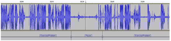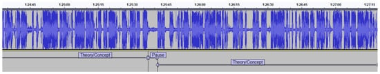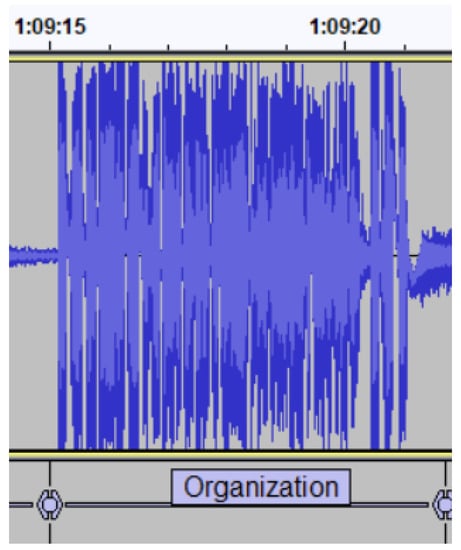 Regarding the audio signals of the recordings, they provided key features of the lecturer’s speech, such as the tone, the cadence or the pauses between utterances. In the following, we show the raw audio waveforms and the corresponding transcription of some of the teaching activities identified in the class recordings. The waveforms were obtained with the Audacity tool [42], a free open-source audio editor and recorder. We examined the raw waveforms of various academic activities and analyzed their differences.
