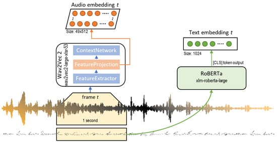 Our system used XLM-RoBERTa [43] to generate embeddings of the automated transcriptions. For the audio signal, we used the Wav2Vec 2 feature extractor [44] to obtain the latent speech representation of the raw audio. The scheme of this preprocessing stage can be observed in Figure 8. The next two subsections explain this stage in more detail.