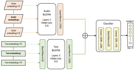 The architecture of our model is composed of two bidirectional LSTM (BiLSTM) layers of 512 units, one for processing the audio signals and one for processing the text transcriptions, and the classifier. A simple diagram of our model can be seen in Figure 9. The classifier is a fully connected layer of 2048 units with a Gelu activation followed by the output layer with a Softmax activation.