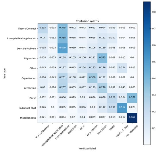 Moreover, the results obtained for the Theory/Concept and Organization classes indicate that, although the values are worse than for the other classes, the model is able to distinguish Theory/Concept and Organization frames. Specifically, the Organization class has a distinctive vocabulary (dates, grading system, submitting exercises) that differentiates it from the other classes. Conversely, the metrics of the classes Digression, Other and Example/Real Application fall behind the rest of the classes. The reason for the poor performance of Digression and Other can be found in the low number of samples of these two classes in the dataset, as these activities occurred infrequently during the lectures, and their duration was usually rather short. In the fourth and fifth column of Figure 10, we can observe that our model hardly predicts frames as belonging to classes Digression and Other. Furthermore, frames of Digression are predicted as belonging to Interaction, while Other frames are misclassified as Organization, Interaction and Indistinct Chat. Furthermore, in the third column, it should be noted that our model is biased towards Exercise/Problem, and predicts a considerable proportion of Theory/Concept, Example/Real Application, Organization and Interaction as belonging to Exercise/Problem.