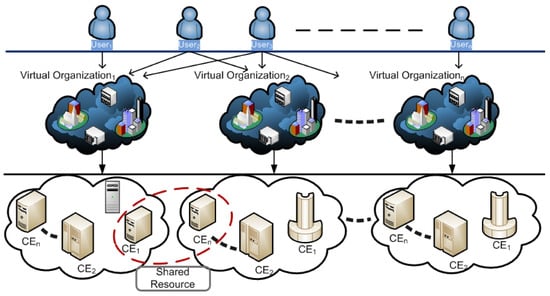 The large-scale scientific computing platform pools resources from many administrative domains, individuals, and institutions to create a Virtual Organization (VO) [3]. VO enables users to access the large amount of computing resources as a single virtualized computing platform distributed across multiple resource provider locations. The interactions between users, VOs, and shared resources are shown in Figure 1. A user may be a member of one or more VOs, and the same resources can be shared across multiple VOs. Additionally, Figure 1 demonstrates that a VO is composed of a number of Computing Elements (CEs). A CE is a collection of computing resources that are physically located at a resource provider site (i.e., a cluster, supercomputer, a computing farm), and the cluster is a collection of Worker Nodes (WNs) that actually perform the tasks.