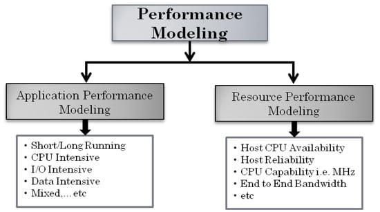 Figure 3 depicts the most commonly used approaches for performance modeling, which consists of application-oriented and resource-oriented predictions. Application-oriented performance models project the execution times of submitted jobs on the distributed system or profile the application based on its runtime (i.e., short or long running times) or resource utilization patterns such as CPU or I/O intensive, or both [17]. The application-oriented method has the benefit of directly addressing the scheduler’s ultimate performance measures (deadlines, runtimes, etc.) [18].