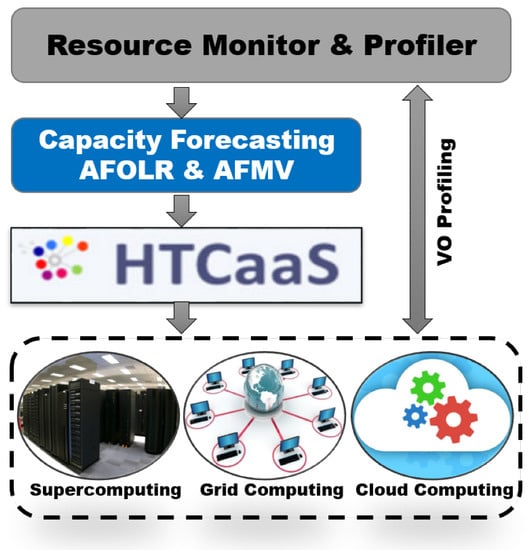 Our HTCaaS (High-Throughput Computing as a Service) [37,38] system could take advantage of this forecasting data in order to efficiently submit a vast number of tasks by using all available computing resources in the Grid, Supercomputers, and Cloud. For example, the drug repositioning simulation needed about 80,000 docking tasks and we were able to successfully complete the experiment by leveraging 2300 CPU cores foretasted by our models. Basically, HTCaaS aims to provide researchers with ease of exploring large-scale and complex HTC problems by leveraging Supercomputers, Grids, and Cloud by effectively hiding heterogeneity and complexity of harnessing different types of computing infrastructures from users. HTCaaS has been effectively integrated with national Supercomputers in Korea, international computational Grids, and Amazon EC2 resulting in combining a vast amount of computing resources to support most challenging scientific problems.