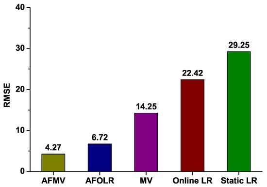In this section, we discuss comparative evaluation results of AFOLR and AFMV schemes with classical linear regression methods and moving average technique. To illustrate quantitative accuracy, we use the Root Mean Squared Error (RMSE) analysis. can be calculated using following Equation (17) where is the actual value at time t, is the predicted one at time t, and p is the number of data points.