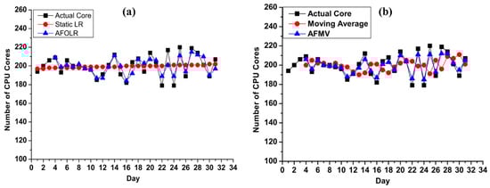In order to further investigate the accuracy of our proposed models, we also compared them with the most widely used linear regression and moving average models respectively. Figure 6a presents the comparative analysis of AFOLR model and conventional Linear Regression (Static LR). It shows that distances from actual data (depicted as “Actual Core”) which means the errors of static LR are relatively high and almost move forward statically. On the other hand, our proposed AFOLR scheme can capture the recent trend and predict the data very close to the actual values (“Actual Core” in Figure 6a). This is because it is capable of adapting to recent fluctuations in computing resource availability. Therefore, the AFOLR model clearly outperforms the LR technique and demonstrates its usefulness in predicting even when the datasets are highly variable. We also compared the AFMV approach against a class of time series-based forecasting techniques such as the moving average. The Figure 6b shows a comparison of our AFMV and moving average. Similar to the results of AFOLR in Figure 6a, it is clear that the AFMV model outperforms the traditional moving average, despite the fact that moving average is a well-known approach for predicting in the short term from highly fluctuating data.
