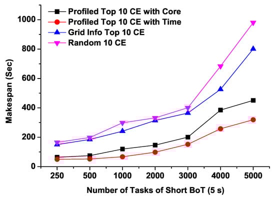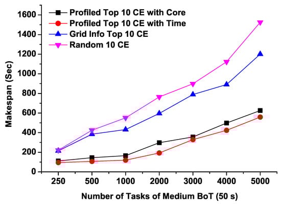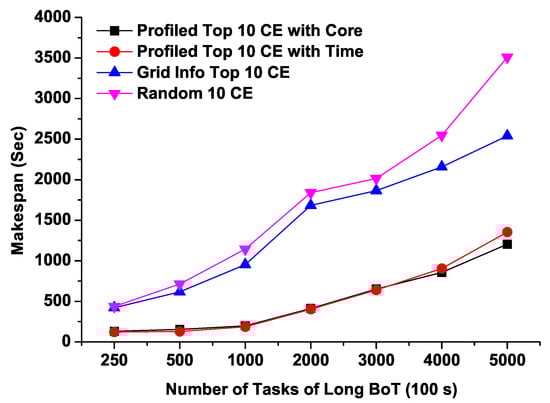 Figure 8 and Figure 9 illustrate the Makespans of medium and long running BoTs respectively as we increase the number of tasks. It can be noted from Figure 8 that both predicted top 10 CEs (“Profiled Top 10 CE with Time” and “Profiled Top 10 CE with Core”) completed the execution of BoT jobs comparatively within very short time ranging from 100 to 600 s for 250 to 5000 tasks respectively. On the other hand, the job completion time of randomly selected CEs takes about 1600 s for 5000 tasks which is approximately 3 times more than that of profiled CEs based on our proposed model. For the long running BoT jobs, both predicted CEs lists show almost identical performance, however for 5000 tasks, CEs having maximum number of free CPU cores exhibits slightly better turnaround time. From this, it can be arguable that CEs having more free cores can perform better for a large number of tasks having relatively long running times.