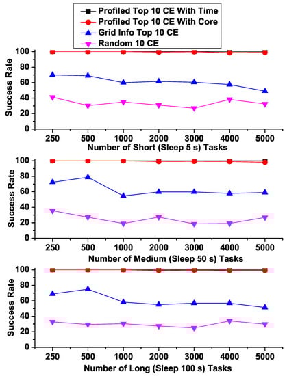 Another important criterion for executing HTC/MTC applications on top of a VO is the Job Completion Rate which refers to the percentage of tasks that can be successfully completed. Figure 10 shows that regardless of task execution times (such as Short, Medium, and Long), both of our predicted Top 10 CEs (“Profiled Top 10 CE with Core” and “Profiled Top 10 CE with Time”) can achieve significantly higher job completion rates than the others. Specifically, both of predicted Top 10 CEs show almost 100% of success rates while “Grid Info Top 10 CE” hovers around 50% to 70%, and “Random 10 CE” shows even worse ranging from 20% to 40%. These results demonstrate that our proposed prediction models can actually improve the user response times and job completion rates for HTC/MTC applications in a real distributed scientific computing environment.