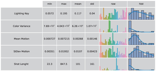The elements of media aesthetics refer to the use of light, colors, screen area, depth, and volume in the three-dimensional realm, time, and movement in videos. The expressive communication of movie producers is based on established design rules, also known as movie grammar. Ref. [28] identified the elements of movie grammar using computable video features to identify the movie genre based on video previews. Their proposal included lightning key, color variance, motion content, and average shot length features along with a well-described algorithm for determining each feature. An improved proposal for aesthetically inspired descriptors applied to a movie recommendation system was presented by Deldjoo et al. [26] and is called stylistic video features. We adopted a basic set of visual features related to color, illuminance, object motion, and shot tempo of the video sequence, as described below.