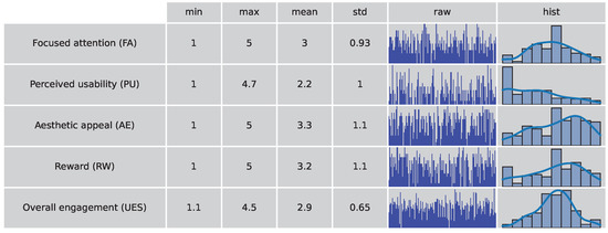 Figure 2 shows the statistics for the UES-SF scores. The scores for the UES-SF dimensions are given on a scale from 1 to 5. The minimum, maximum, mean, and standard deviation are summarized in the first four columns. The randomized bar graphs in the fifth column represent the individual dimension values of engagement bound to each consecutive observation. The last column contains the histograms. The values of Focused Attention (FA) are distributed over the entire score range in a near-normal shape. Perceived Usability (PU) scores tend to express a high number of lowest rates (1), with other values distributed uniformly. The distributions of Aesthetic Appeal (AE) and Reward (RW) tend to dominate in high values between 3 and 5. Overall engagement score (UES) expresses appearance of a normal distribution with a mean value of 3 but of a relatively small deviation.