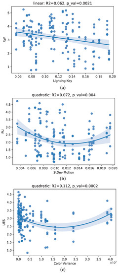 Several cases indicate that there may be more complex dependencies in addition to a simple linear relationship. Considering the U-shaped (or possible inverted U-shaped) relationship between a perceived response and its stimulus, which is often found in studies on human behavior [35,36], nonlinear modeling was also considered. At this stage of the study, the goal was to identify the nature of the relationship rather than to define an optimal model. A quadratic model was applied as the simplest nonlinear model capable of capturing non-monotonous relations. An example of a possible U-shaped relationship between Standard deviation of Motion and the UES-SF dimension Perceived Usability (PU) is shown in Figure 3b. Figure 3c represents a U-shaped relationship between the mean value of Color Variance and overall User Engagement Score (UES).