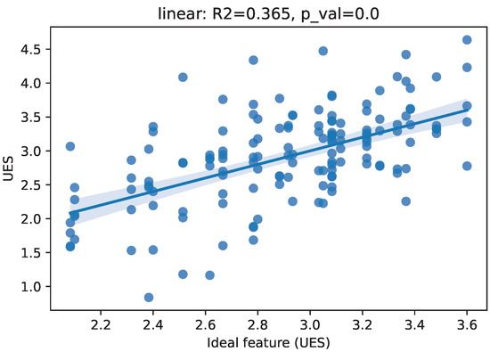 An example of a scatter plot and the corresponding linear regression plot for overall User Engagement Score (UES) is shown in Figure 4. A high level of variability in consumer engagement can be observed for each video.
