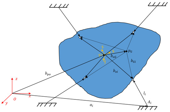 Moreover, in Figure 1, the position of the gravity center represented in and is denoted as and , respectively; denotes the vector from the selected origin of with the unknown gravity center in , and represents the same vector in . The location of the ith motor in the original coordinate system is denoted as , with i = 1, …, n in , and the cable anchor point at the end-effector is represented as and in and , respectively. Here, represents the vector from the origin of to the origin of in , and the rotation relation between the two coordinate systems is formulated by the rotation matrix R shown below, which is associated with the three Euler angles , respectively representing the roll, pitch, and yaw angles [15].