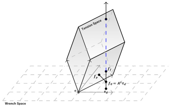 However, when the ideal tension is located outside of the tension constraints, reductions in and can actually lead to conflict, especially considering that updating may cause a divergence in tension from the desired wrench. In detail, as seen in Figure 2, denotes the optimal tension selection out of the feasible tension space. The dashed line passing through , , and denotes the set of all the tension solutions corresponding to the desired ; the blue part of this dashed line in the tension space denotes the feasible tension solutions, denotes the feasible tension solution closest to , and represents the solution that is nearest to in tension space. If we fix and only update following Equation (34), the tension value converges to , reducing to the minimum. Moreover, even when we update the original fixed with Equation (33), when changes the value of the tension may deviate from the feasible tension solutions related to the desired control wrench.