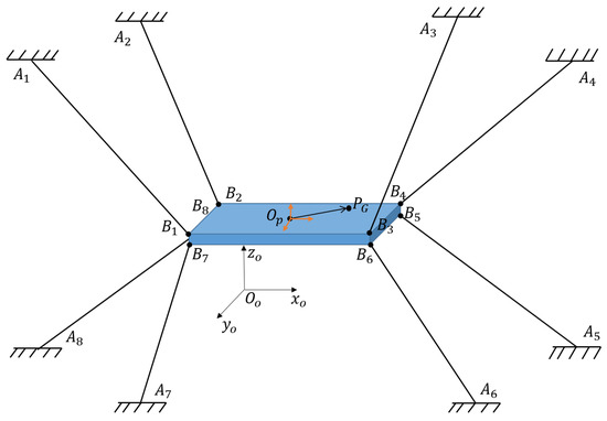 In order to verify the efficacy of our strategy, a simulation study of a cable-driven robot with six degrees of freedom and eight cables was conducted. This robot’s geometric structure and configuration model are depicted in Figure 3.