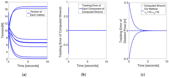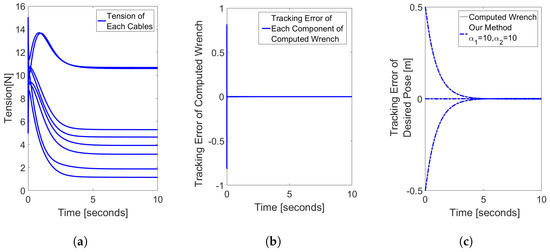 First, we constructed a simulation to validate the effectiveness of a tension distribution approach that satisfies the tension requirements and tracks the computed wrench without considering the optimization problem associated with tension distribution. The in this method is , while the control gains are , , . The desired pose is selected as . Figure 4 represents the simulation result of this method.