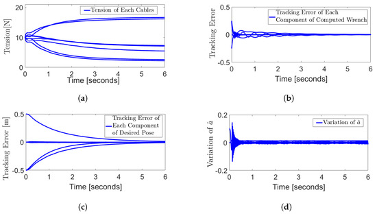 Results of Simulation 3. Parameters and desired pose are selected as , , , , , , . (a) Tension distribution. (b) Tracking error of computed wrench. (c) Tracking error of desired pose. (d) Variation of .