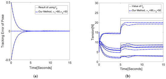 The gray line of the closed-form method varies at 5 s and 10 s, changing to a maximum of roughly 5 N, as shown in Figure 8, and a significant disturbance in the tension occurs when the desired position is changed. The blue dotted line in the figure shows that our method with the selection of and efficiently reduces this disturbance and eliminates the impact of the discontinuous shift of the desired pose. The tracking error of the desired pose of the two methods shows that our method can effectively track the desired pose even with a low , in this case; however, it is slightly slower than the closed-form method.