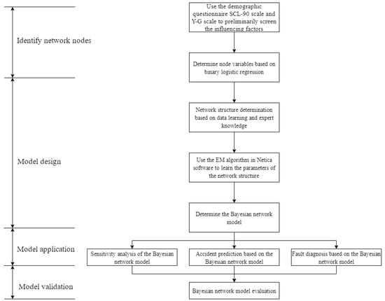Flow of constructing the Bayesian network model for evaluating bus drivers’ mental health and traffic safety.
