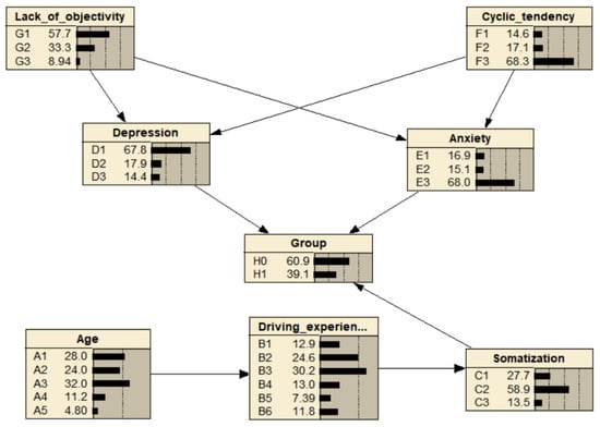 Bayesian network model of bus drivers’ mental health and traffic safety assessment after Netica parameter learning.