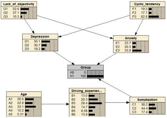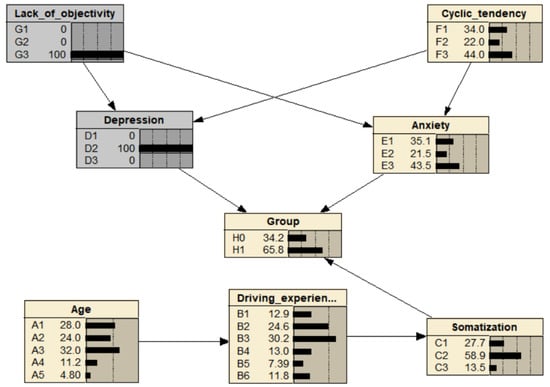 Any two-node states in Table 5 were set to 100%, updating the network. Compared with the results of Figure 5, the results with more obvious accident probability were shown in Table 6. For example, in Netica, setting the status of “G3” and “D2” to 100% determined the status of the evidence variable. The changes in the probabilities of relevant nodes were observed by updating the probability of the entire network, namely the probability changes of “Group” and other nodes (see Figure 6). In this case, the probability of an accident increased from the initial 39.1 to 65.8%. This suggests that if the bus driver is depressed with high subjectivity, the probability of an accident increases significantly.