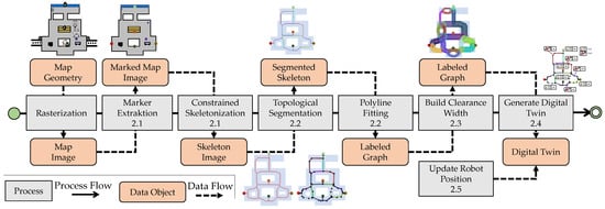 First, the map with the tasks is saved as an RGB image, where the individual tasks, routes and obstacles are coded in the appropriate color. Then the separated events in the image are extracted as markers. A distinction can be made between “passable”, “not passable”, “position of the robot”, and “tasks to be passed” in the marker extraction Section 2.1. Via a shrinkage also referred as constrained skeletonization in Section 2.1 the task markers are used as constrained conditions to calculate the skeleton in the passable area. This skeleton links the individual tasks in the traversable domain. The skeleton can be decomposed into individual path segments using a topological segmentation in 2.2. Since the paths are still in the form of pixel chains, they must be reduced to simple edges and nodes to a graph using a collapsing procedure in 2.2. This graph is then enriched with the local passage width in 2.3. The digital twin can now be obtained directly from the paths as well as from additional information in 2.4. Finally, based on the digital twin, the ability to reposition the robots must be integrated in 2.5, which have left the path with some uncertainty in 2.5. In the following, the individual concepts are explained schematically using a simple example. For each chapter section, a corresponding result of a more detailed use case can be found in Section 3.1, Section 3.2, Section 3.3, Section 3.4 and Section 3.5. Furthermore, several additional use cases of complex 2D maps in 3.6, of 3D maps in 3.7 and of real world maps in 3.8 are considered.