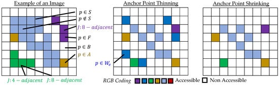 In this work, a so-called homotopy-preserving anchor point shrinkage is chosen for path-finding derived from thinning method of [13], due to its desirable properties of the centered path and topology preservation. Therefore, a simple point condition is checked by considering the preservation of Euler characteristics and the connectivity via an adjacency tree. While the thinning method of [13] uses other shape preservation criteria such as endpoints for the curve skeletons or surface skeletons, this work is restricted exclusively to homotopic shrinkage with so-called anchor points. Anchor points are points with that must not be removed during erosion. Once the process has converged, the skeleton is obtained from the remaining pixels with . Figure 2 shows a comparison between anchor point thinning and anchor point shrinking of a simple example image. While thinning almost preserves the green and purple pixel chains, shrinking reduces them to a single pixel. If anchor points (dark yellow) are considered, the linkage of the skeleton is guaranteed during thinning and shrinking. The main advantage of anchor point shrinking is the extraction of minimalistic skeletons, that only consider the respective anchor points and the topological paths (see also Section 3.1).