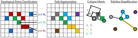 with and for (see Figure 3). Based on that segmented skeleton aa digital twin including the associated information such as the tasks can be derived. For this purpose, the pixel chains are first simplified using a so-called collapse metric. It is ensured that by simplifying the path , the distance of a pixel to the simplified polyline may differ by at most -pixels (see Figure 3). In this simplification, each step checks that the topological properties are preserved. The following figure shows the segmentation of each point based on neighborhood connectivity, the segmentation of each path based on branch and endpoints, the collapse metric, and the simplification to a graph. Branch points, which are connected to each other (green), are reduced to one point.