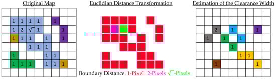 The passage width can be estimated from the map geometry in combination with the corresponding paths. The skeleton itself has the advantage that it is located in the center of the geometry (see Figure 10). Thus, only the shortest distance from the skeleton to the respective boundary has to be calculated for the approximation of the passage width. This can be achieved with the so-called Euclidean distance transformation. For each pixel, the distance to the boundary is calculated. Then the distance values of the respective path can be taken based on the pixels, where the smallest value is the passage width with