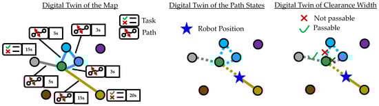 In our case, the processing time, the possibility to create a certain path between two tasks, as well as the passability of a path, have to be considered in the digital twin. The passability of a path is stored as a Boolean value with (False, True). The time duration in the graph is stored as a numeric value referred to the path and the respective tasks. This travel time of a path can be used to estimate the initial position of the robot along the path, which can also be updated locally during operation. Figure 5 shows the digital twin and the additional information stored. This twin is continuously adapted to the respective robot positions.