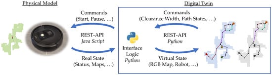 The main architecture chosen is a microservice architecture with a REST interface. The communication between the robot and the server is performed via [46] and the communication between the server and the digital twin is performed via a Python interface. This interface converts the map into an RGB map and identifies the current position of the robot. Figure 7 shows the architecture used in the example of a vacuum cleaner robot and the operation of the generated digital twin (no generation, only updating).