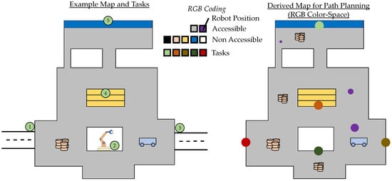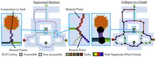 The map is coded as an RGB image. Here, the different tasks are each marked with their own color. In the following, the skeletonization described above is applied to this map.