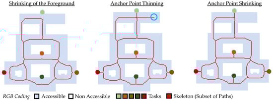 While shrinking the maps leads to topology-preserving paths, it lacks in linking to the individual tasks. The path suggestion with anchor point thinning can link the individual tasks, but also generates paths (cyan circle) that are not useful (low robustness). Anchor point shrinking shows appropriate minimalistic paths for the robots to access each task. This method leads to a high robustness and ensures that every possible path is captured.
