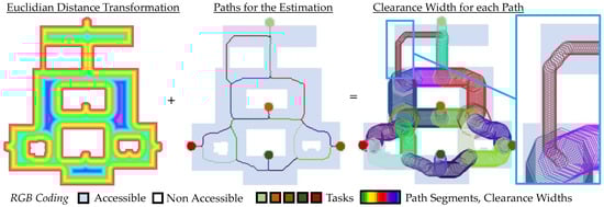 Clearance width estimation: map with Euclidian distance values, colored representation, and estimated clearance width of each path.