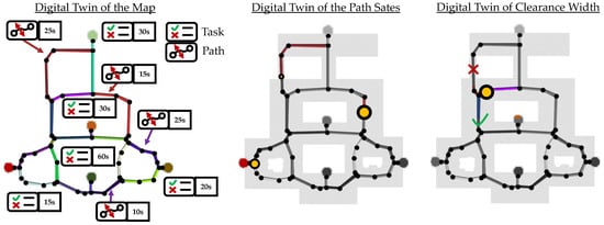 Furthermore, while the works in [25,26,27] focus on path generation and the works in [2,10] concentrate on the use of path generation of existing twins, this work is mainly concerned with the connection between path generation and digital twin. For example, if the path changes due to altering environmental conditions, this directly leads to an adjustment in the twin. This flexibility enables the fully automated generation of digital twins based on simple map layouts. All combinations of path algorithms and digital twins are based on the use of pathfinding in the digital twin, which does not change during operation as a virtual model (only the states and values in the twin). In this work, however, the digital twin is generated directly from pathfinding, which consider changes in the environment.