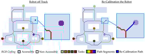 If a new skeleton is found, the paths for repositioning can be found with . These paths can be simplified to polylines analogous to Section 2.2 and given clearance widths analogous to Section 2.3. Figure 6 as well as figures in Section 3.5, show several examples of a repositioning considering the anchor points. In particular, in Figure 6 a robot deviation is marked as a gray pixel, which leads to an additional segment and a corresponding calibration.