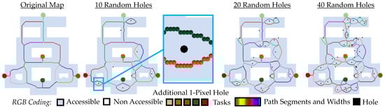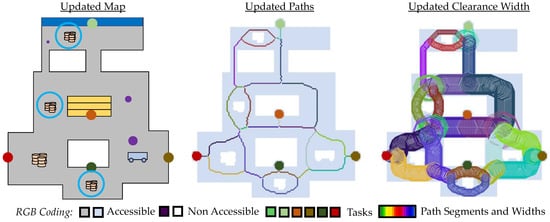 If suitable maps are available, the paths can be estimated fully automatically. In contrast to the alternative path algorithms, A* or Dijkstra applied on the whole environment, topological reduced paths with alternative routes can be considered by anchor point shrinking implicitly (see Figure 11). These additional paths can be used to avoid an obstacle or a hole on two sides. Since path generation is mainly determined by the traversable area, only the paths to each task change locally if additional obstacles occur also locally (see Figure 16 and Figure 17). The paths to avoid new obstacles change only locally, resulting in robust routing and human-expectable behavior. For example, in A* on the whole environment, the path layout changes greatly when the position of the target or task also changes (see Figure 11). This can lead to unexpected behavior, causing the agent to fidgety implement the path changes.