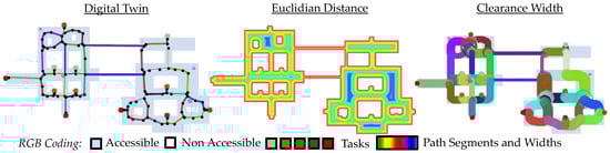 Once a path is found, it can be used to build a graph that serves as the basis for the digital twin. In the examples from Section 3, robust derivations of the twin were shown. For this purpose, the paths were supplemented with additional information such as the automatic path width or the manual specification of turn times. A change in the environment shows a change in the digital twin. Especially worth mentioning is the locality of the process. For example, if a new obstacle is suddenly found on the map, the paths and the robot commands only have to be adjusted locally. As a result, all unaffected robots can perform their task without modification. In addition, the path width specification offers the possibility to let opposing robots drive (left, right) if they can drive side by side including the size of their payload. Based on this twin, a state diagram could be created to evaluate drivability. Likewise, based on this, the position of the robots along the paths can be directly recorded. If repositioning is necessary, the individual paths for the paths of the robots can be generated locally without affecting the global paths of the digital twin. This combination of robust path generation, but also the possibility of paths for repositioning that do not affect the original paths, results in a robust twin. Since bridges, overpasses, or underpasses may also be present in the application, the procedure in Figure 22, Figure 23 and Figure 24 were extended to 3D. The results show reasonably automated path generation even for 3D maps. However, the biggest drawback is the need for accurate RGB coding in the map and an accurate map layout. In real-world applications, a variety of artifacts can be caused by different sensors. In addition, these errors are not accounted for in the procedure described above, so further approaches to filtering the errors and capturing multiple maps has to be pursued in the future.